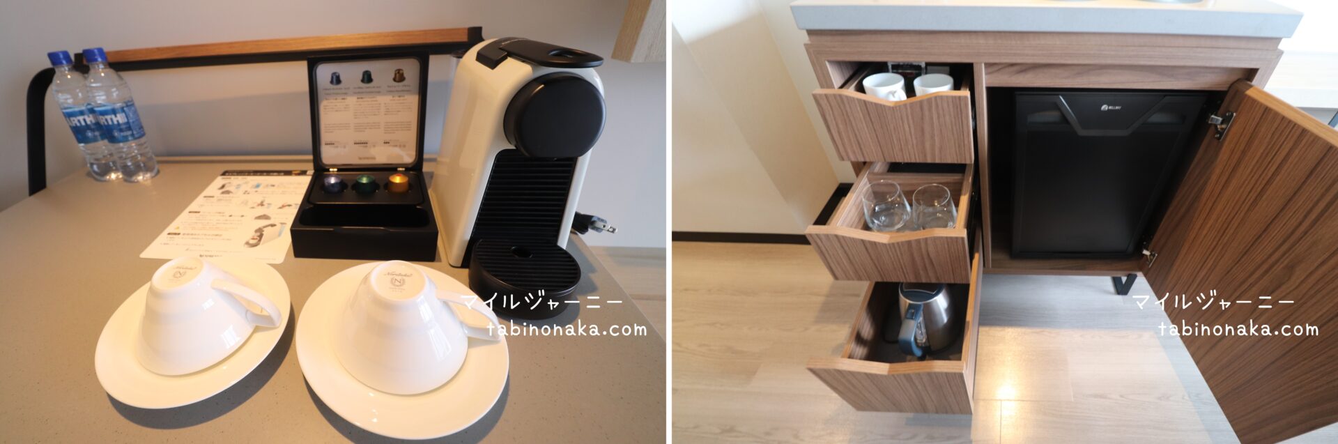 ネスプレッソとコンプリメンタリーの水。さんぴん茶のティーパックもあり。