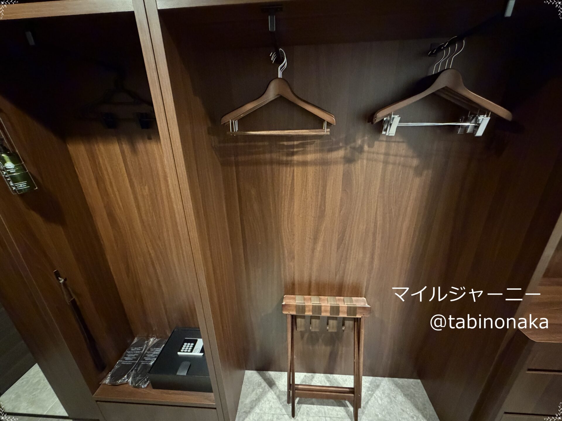 オープンクローゼットにはラゲージラックとセーフティボックス、スリッパなど。