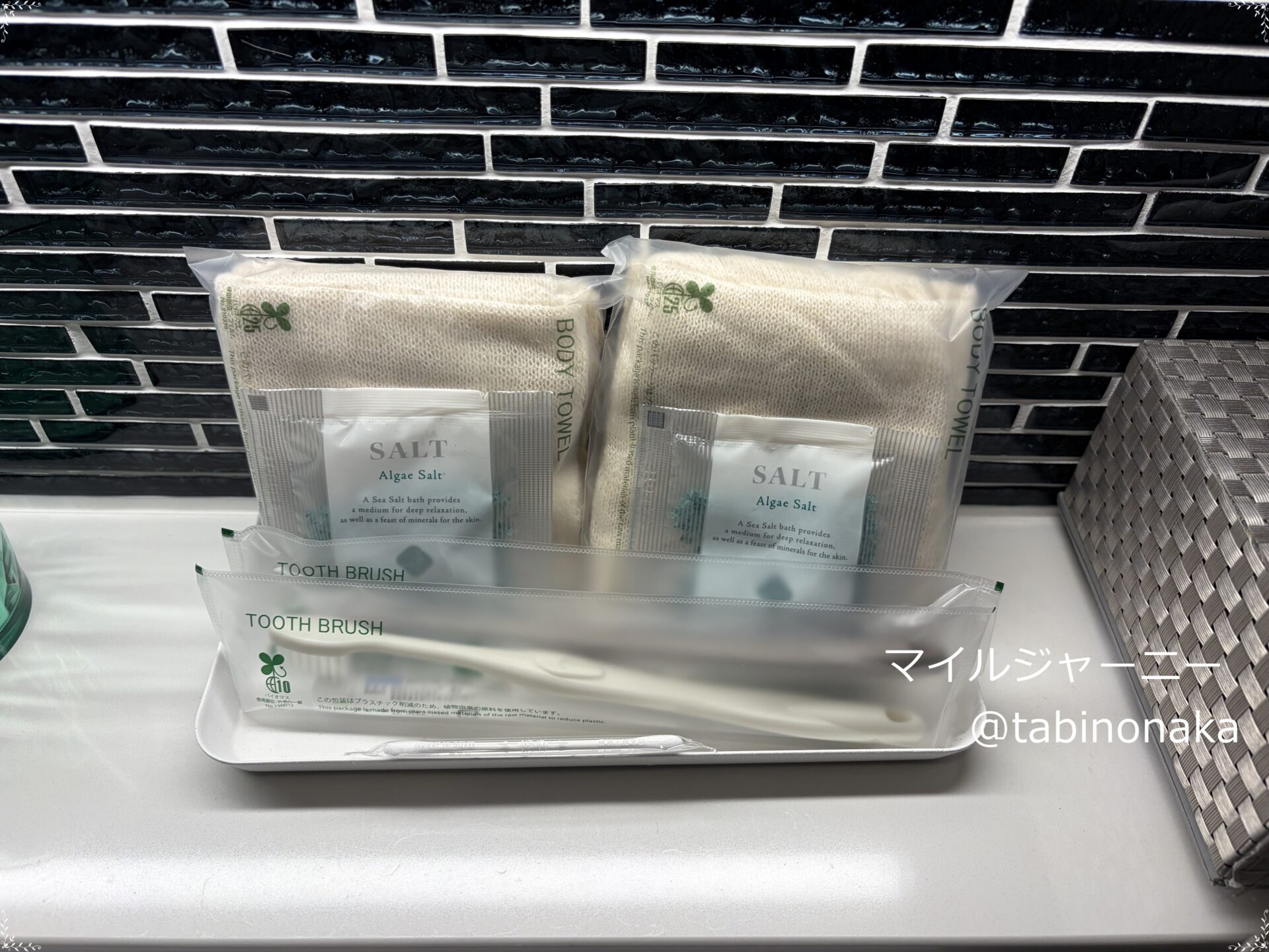 ボディタオル、バスソルト、歯ブラシとアメニティは必要最低限だけど、我が家には充分です。