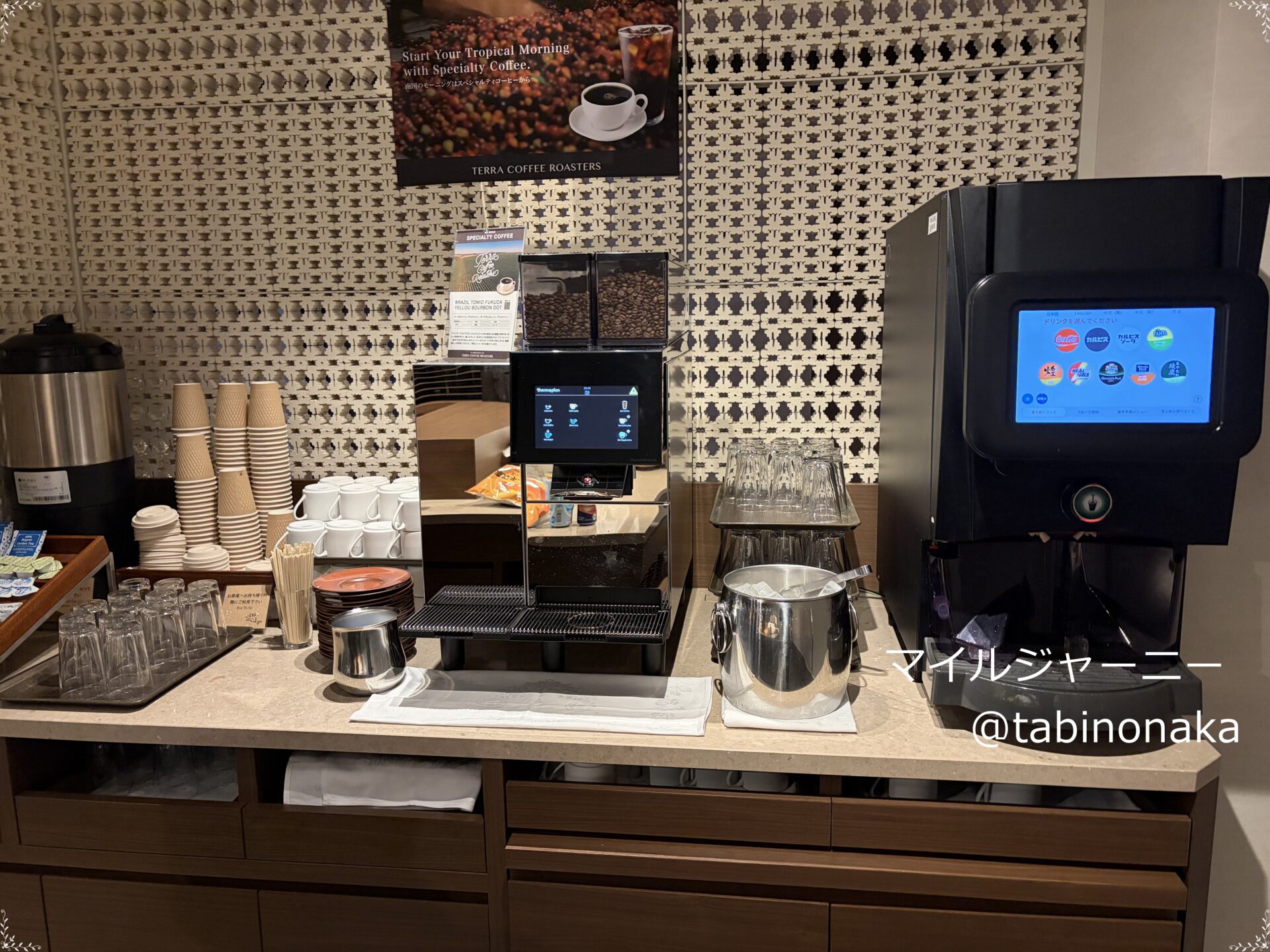 コーヒーやソフトドリンクがいただけます。部屋に持ち帰ることも可能です。